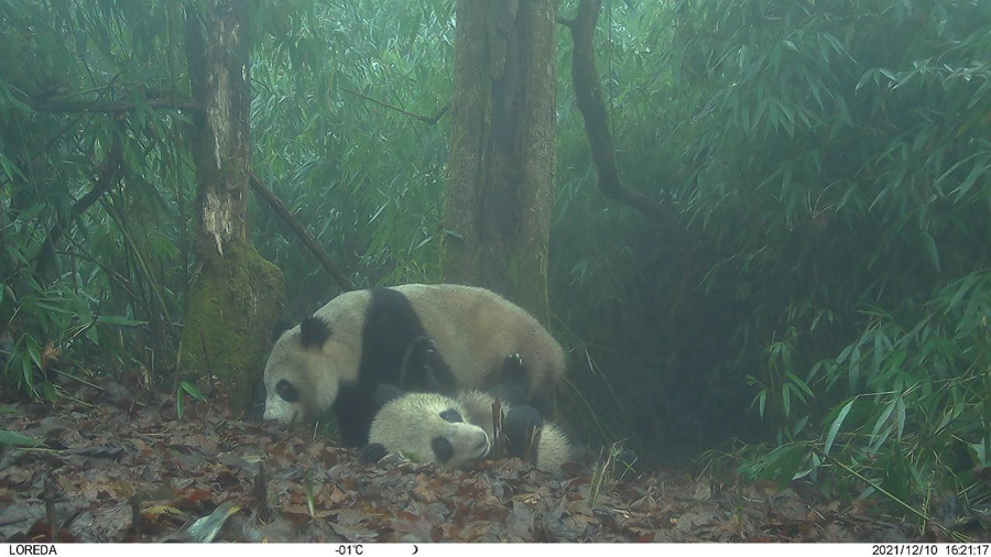 野外布设红外相机拍摄到的野生大熊猫母子活动画面。